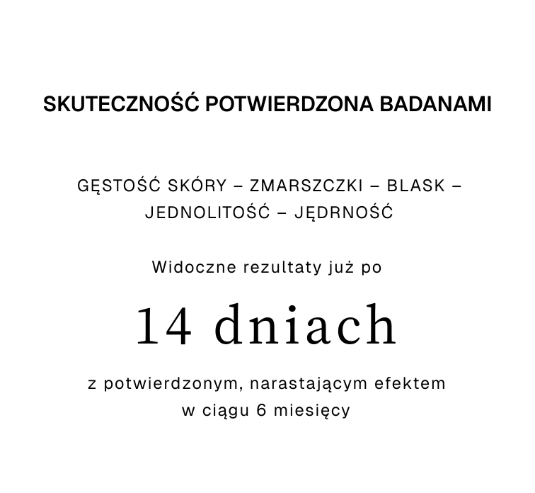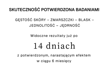 Już po 1. miesiącu stosowania widoczne są pierwsze efekty. Wszystkie oznaki starzenia są zmieniejszone. Skóra jest widocznie odmłodzona. Odzyskuje naturalny blask i jędrność. Zmarszczki są wygładzone.
