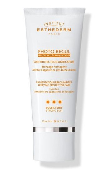 Lorsque les taches pigmentaires sont installées, il est nécessaire de se protéger avec un soin adapté pour empêcher qu'elles ne s'intensifient et ainsi conserver un bronzage uniforme. Particulièrement adapté au zones plus exposées du visage, des mains et du décolleté, le Soin Protecteur Unificateur PHOTO REGUL Soleil fort favorise le bronzage et unifie le teint des peaux présentant des irrégularités pigmentaires, tout en diminuant l’apparence des taches brunes.